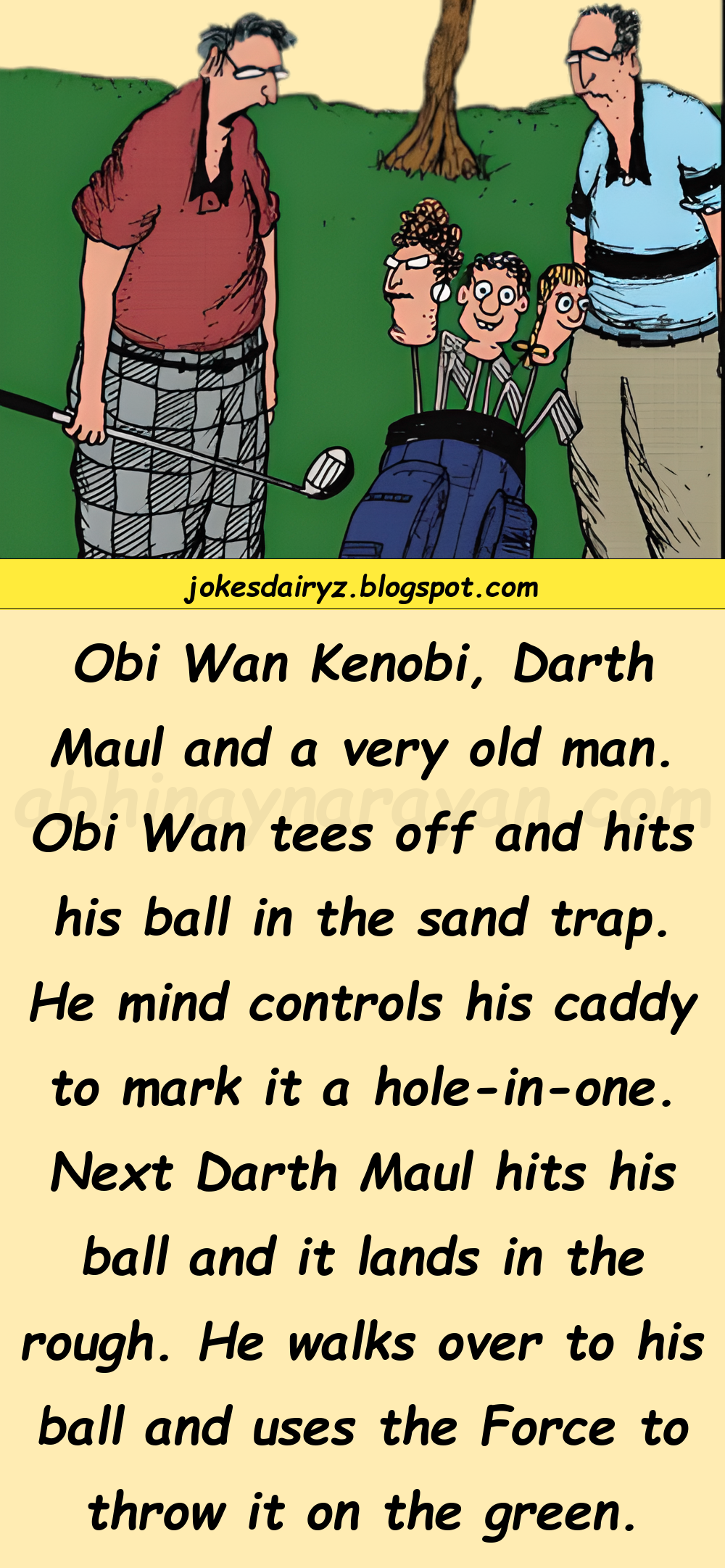 Obi Wan tees off and hits his ball in the sand trap. He mind controls his caddy to mark it a hole-in-one.