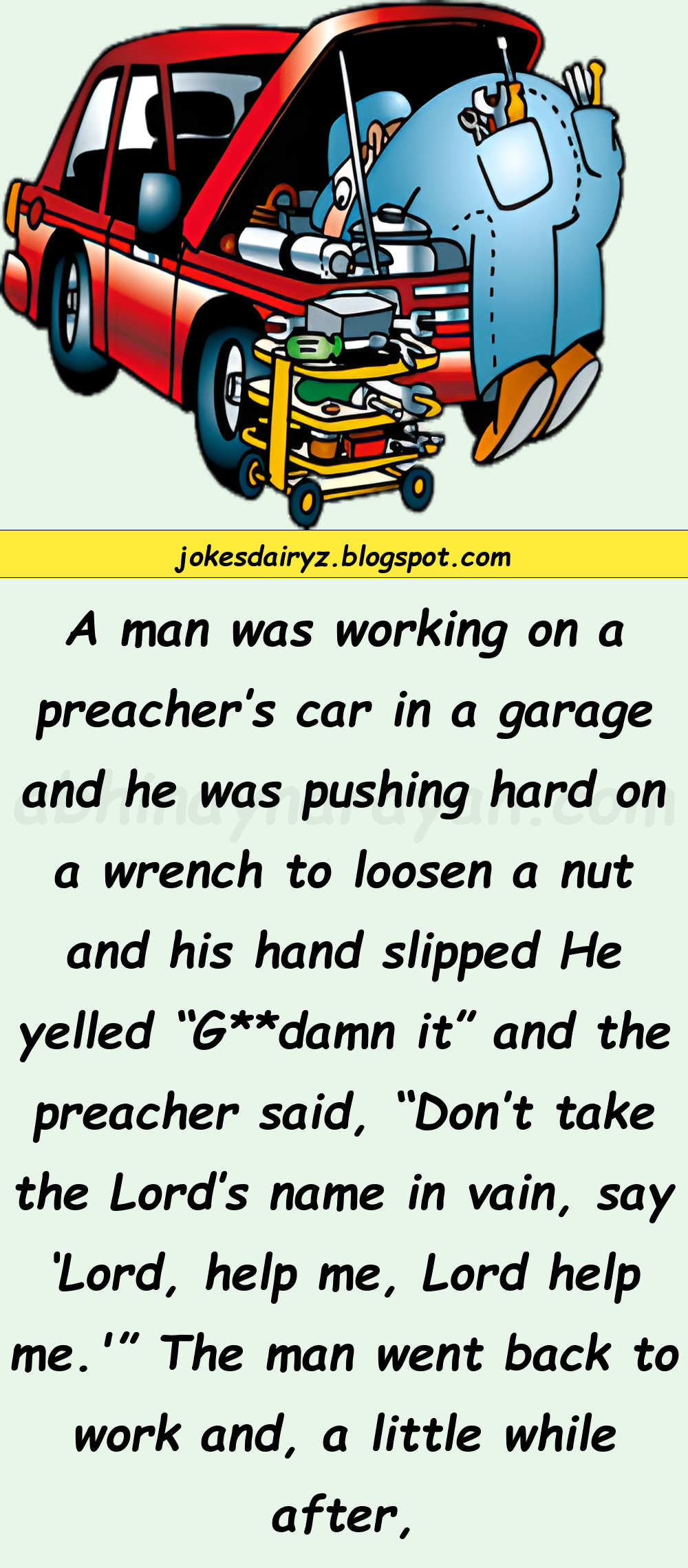 A man was working on a preacher’s car in a garage and he was pushing hard on a wrench to loosen a nut and his hand slipped