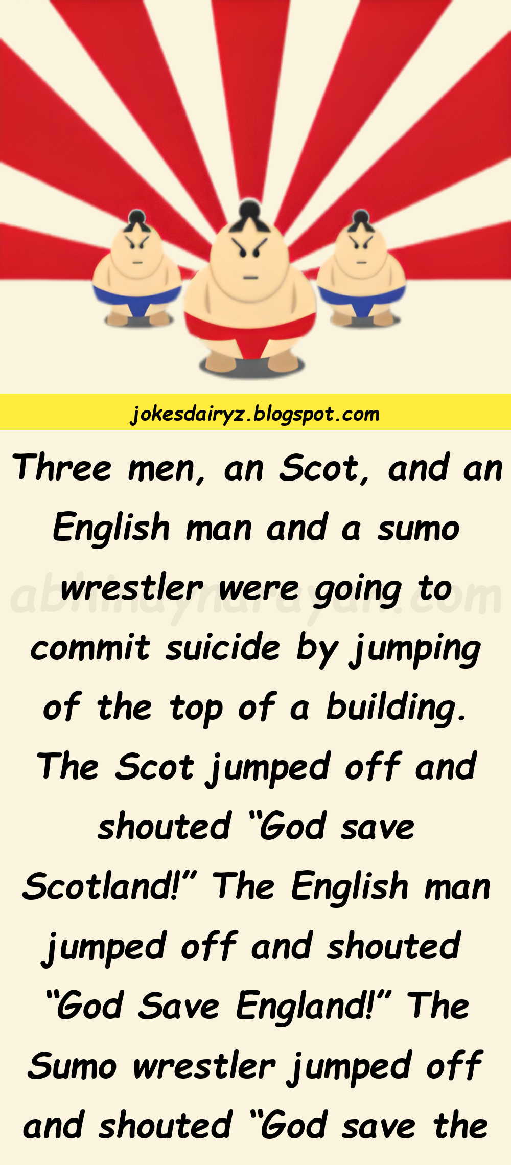 Three men, an Scot, and an English man and a sumo wrestler were going to commit suicide by jumping of the top of a building.