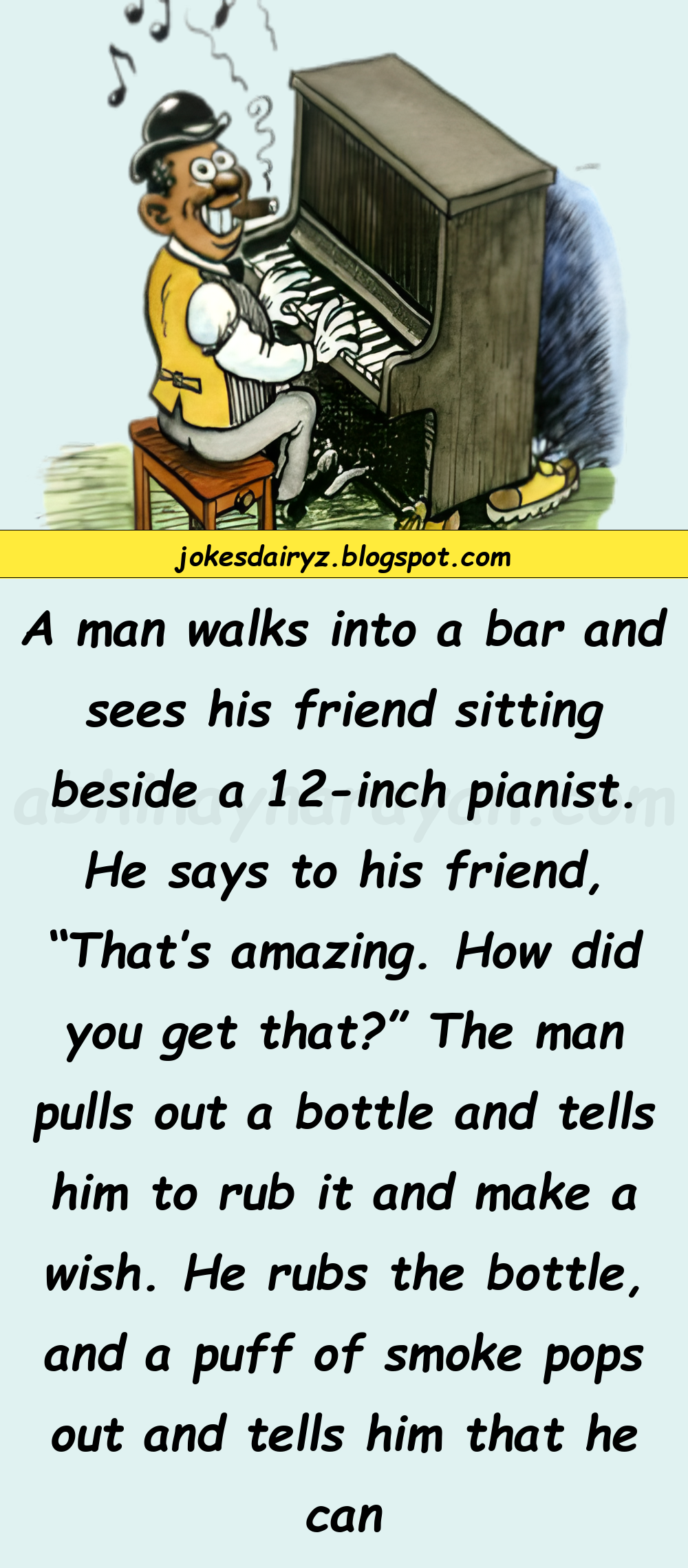He goes back in and tells his friend what happend, and his friend replies, “I know. Did you really think I wanted a 12-inch pianist?”