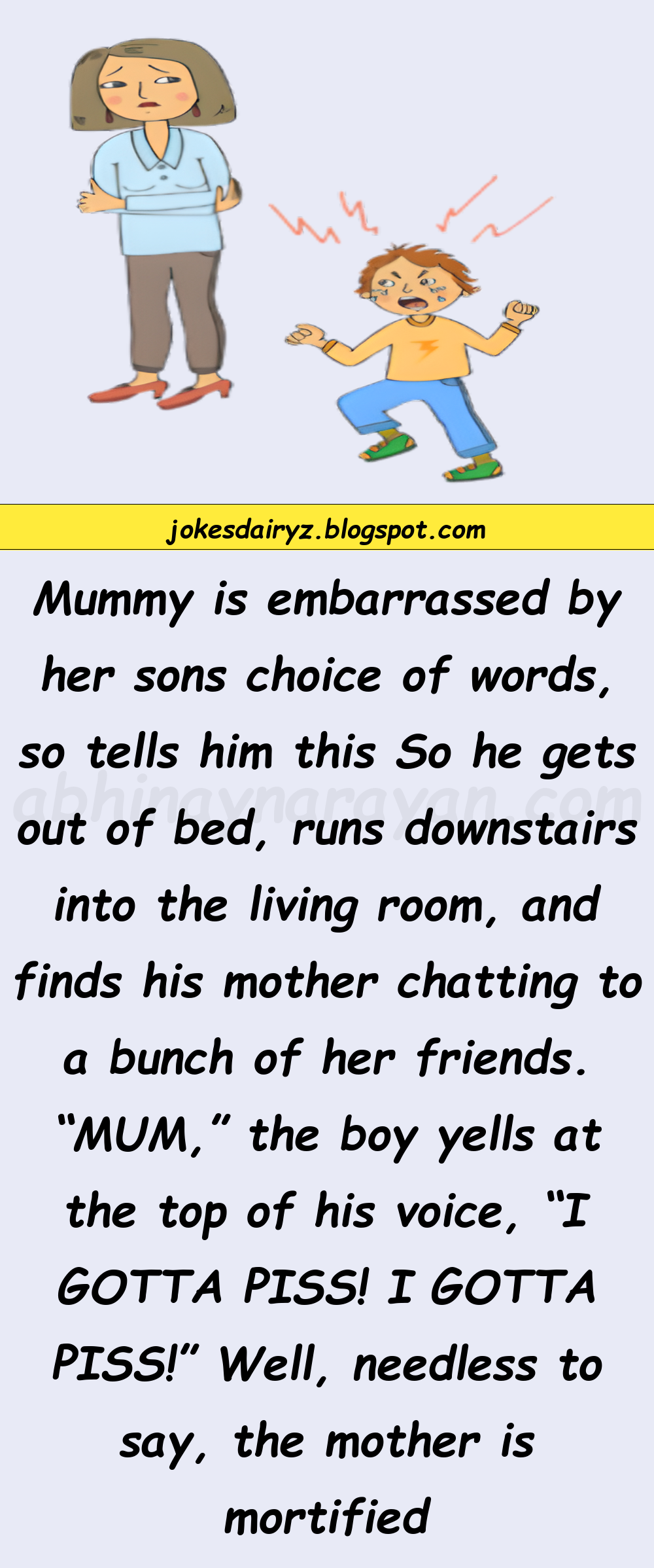 “MUM,” the boy yells at the top of his voice, “I GOTTA PISS! I GOTTA PISS!”