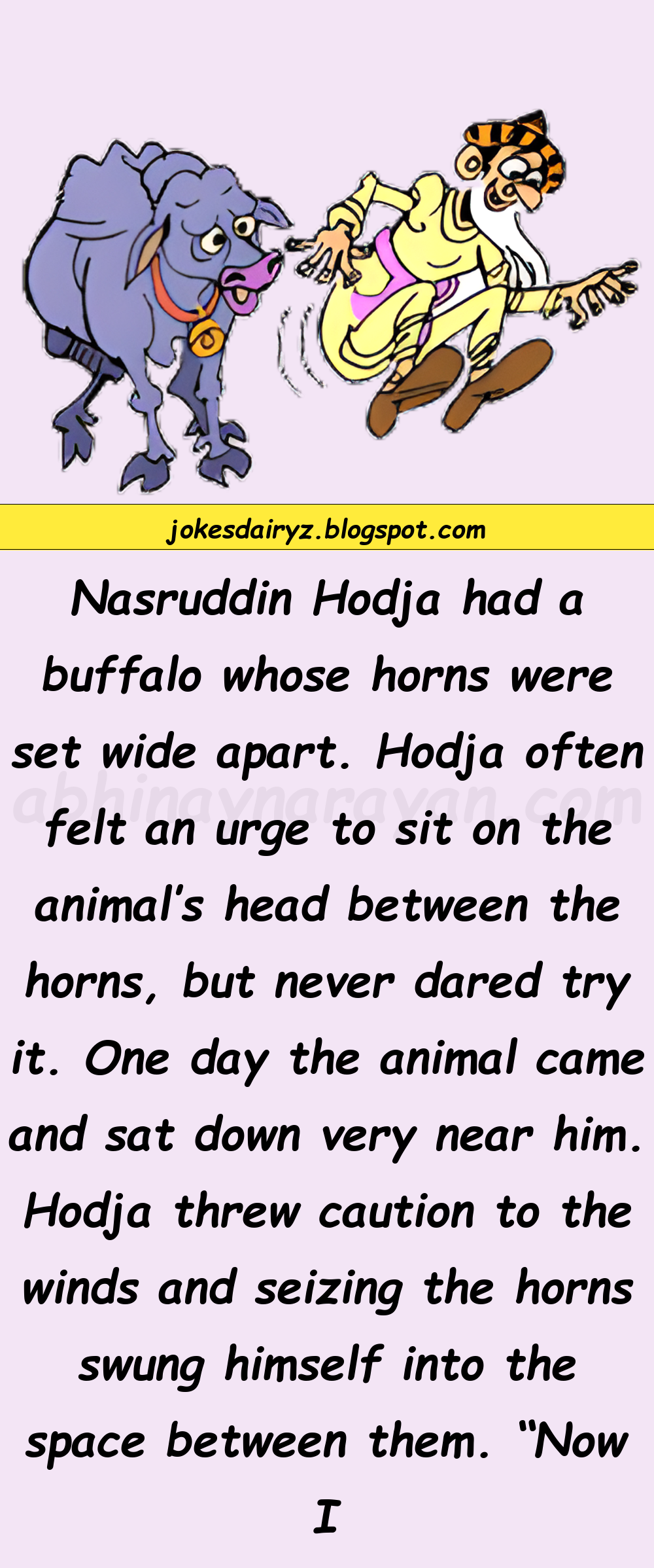Nasruddin Hodja had a buffalo whose horns were set wide apart.