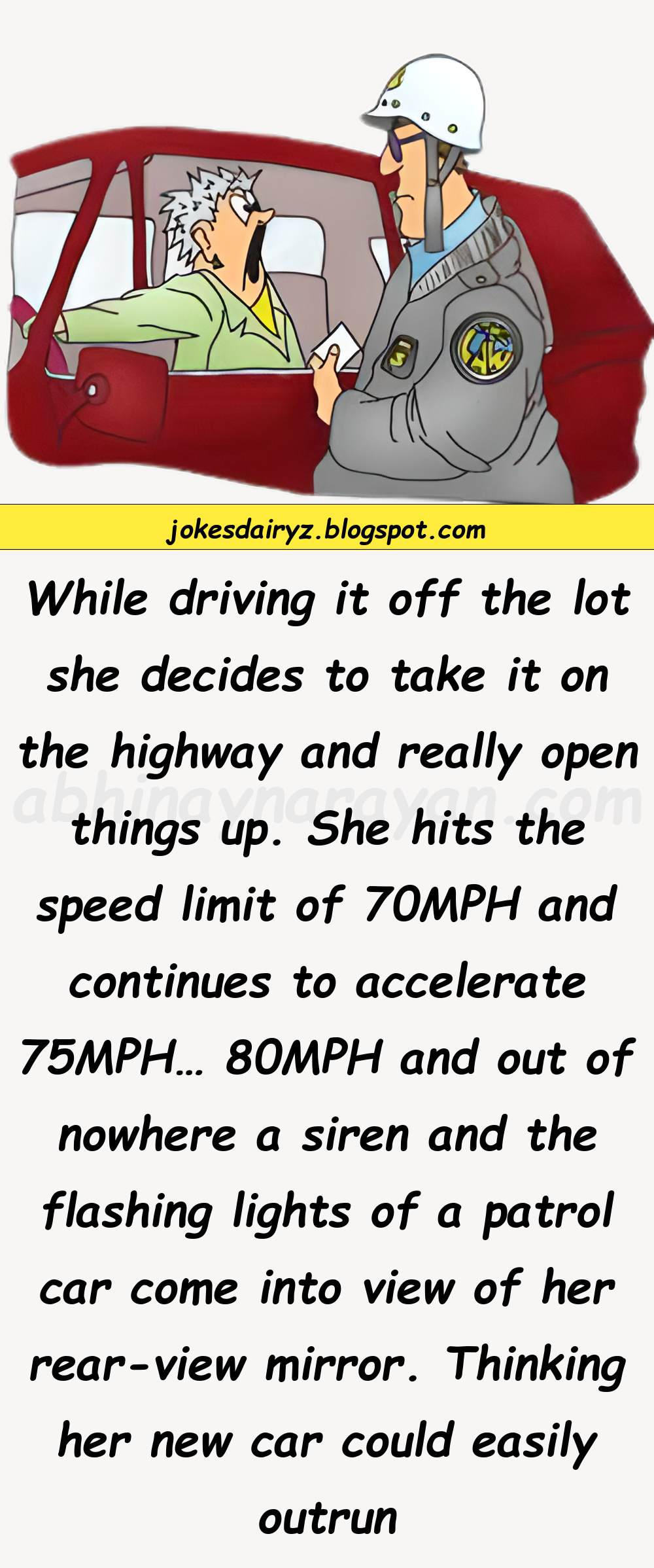 She hits the speed limit of 70MPH and continues to accelerate 75MPH… 80MPH and out of nowhere a siren and the flashing lights of a patrol car come into view of her rear-view mirror.