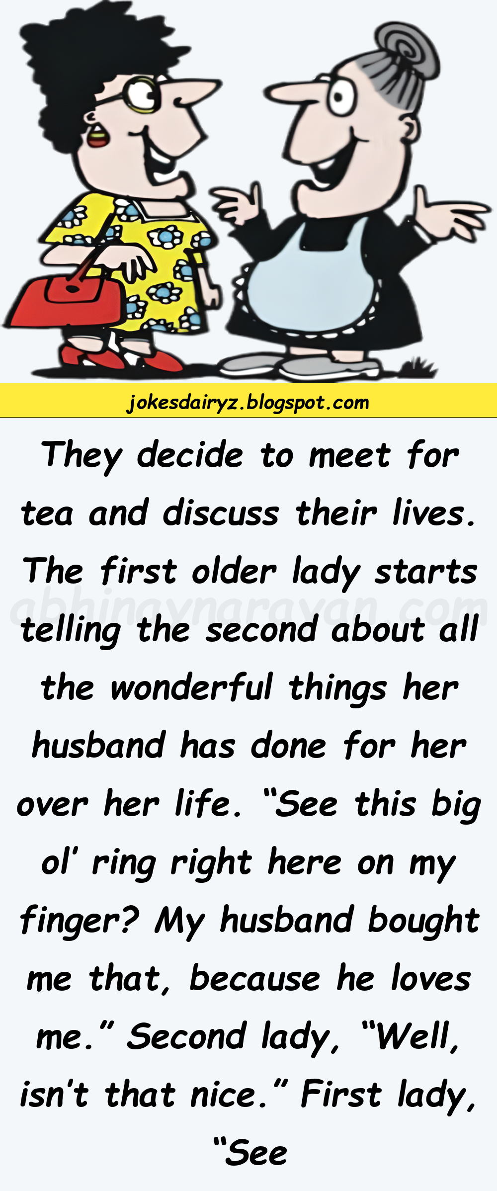 The first older lady starts telling the second about all the wonderful things her husband has done for her over her life.