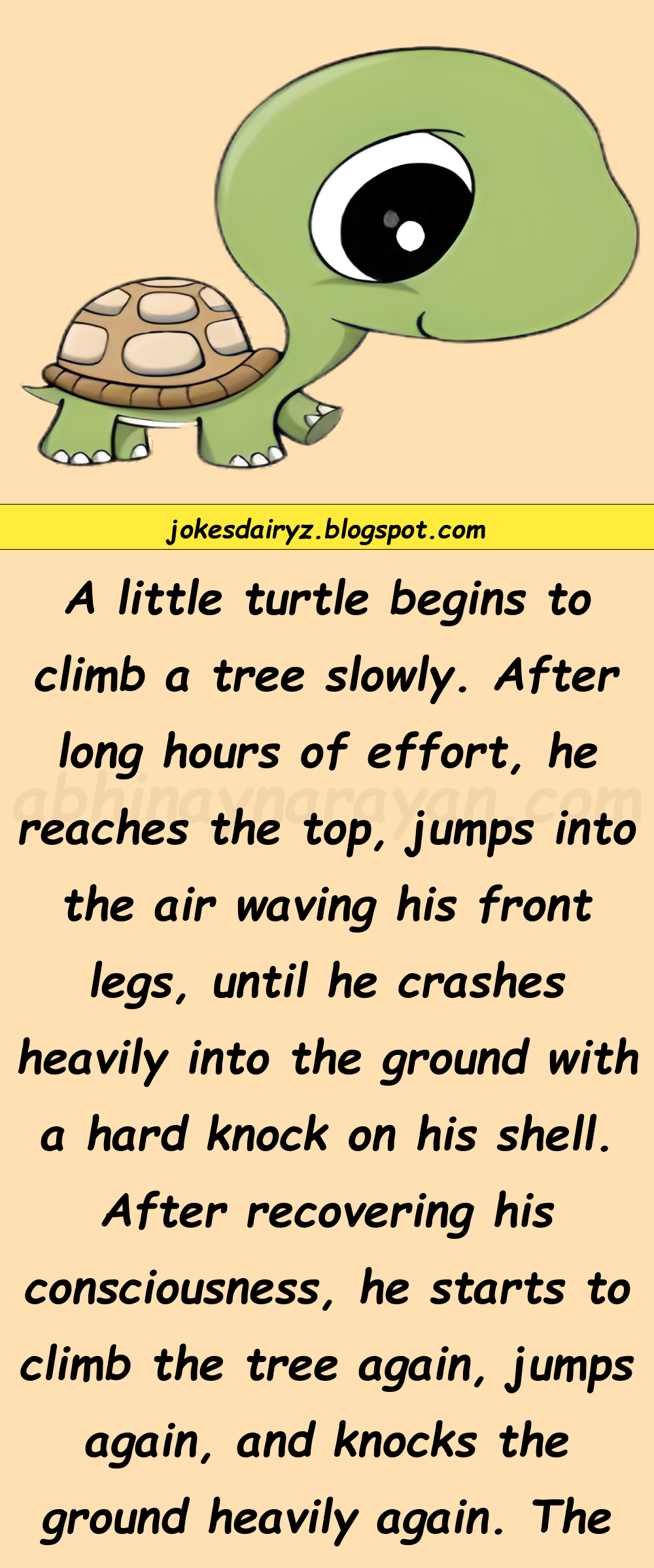 After recovering his consciousness, he starts to climb the tree again, jumps again, and knocks the ground heavily again.